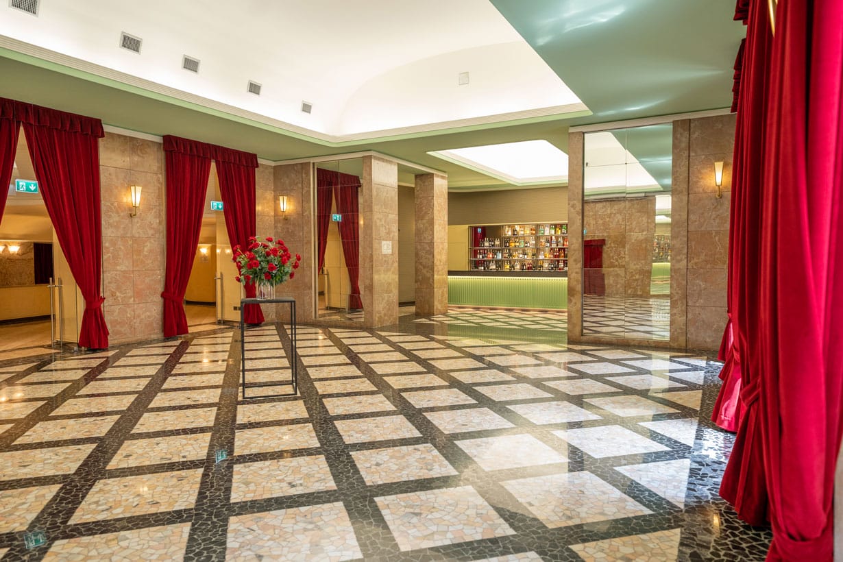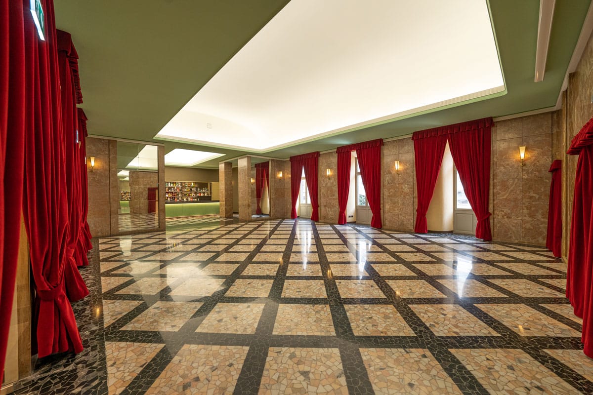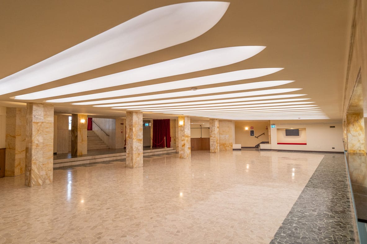Il mosaico di Roberto Aloi dà il benvenuto nel foyer d’ingresso del teatro, emanando un’atmosfera accogliente e raffinata. Una scalinata conduce al foyer ridotto, dove trova posto un pratico bancone bar, rendendo lo spazio perfetto per gestire l’accredito e i momenti food & beverage dei vostri eventi.