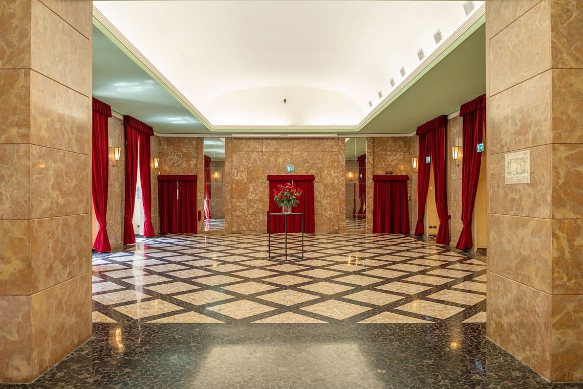 L’adiacente foyer offre ulteriori possibilità di utilizzo dello spazio, adattandosi con versatilità a diverse tipologie di eventi.